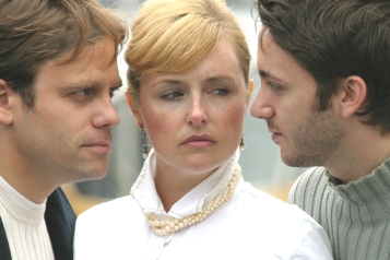 (Kristen Vermilyea) at his rival Tom Crean (Keith Chandler)